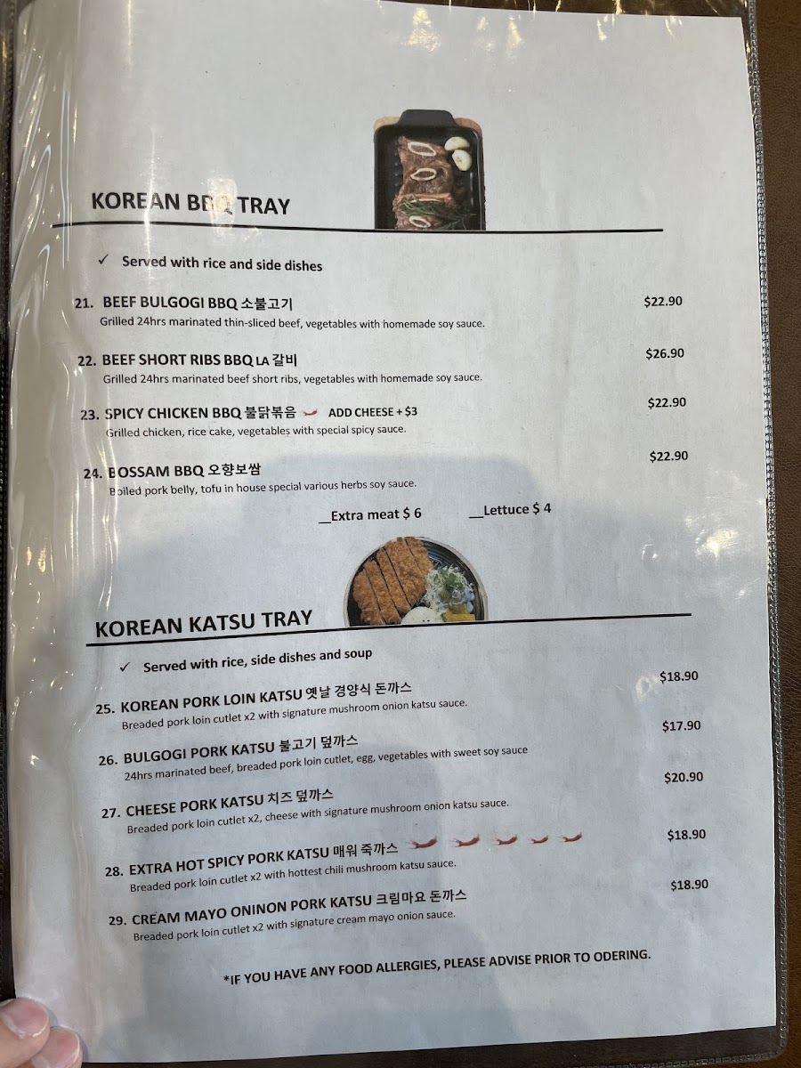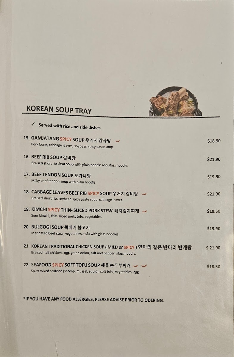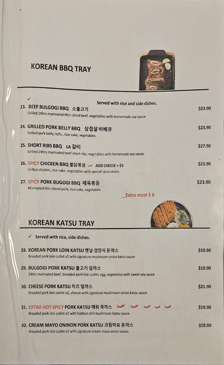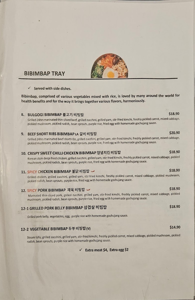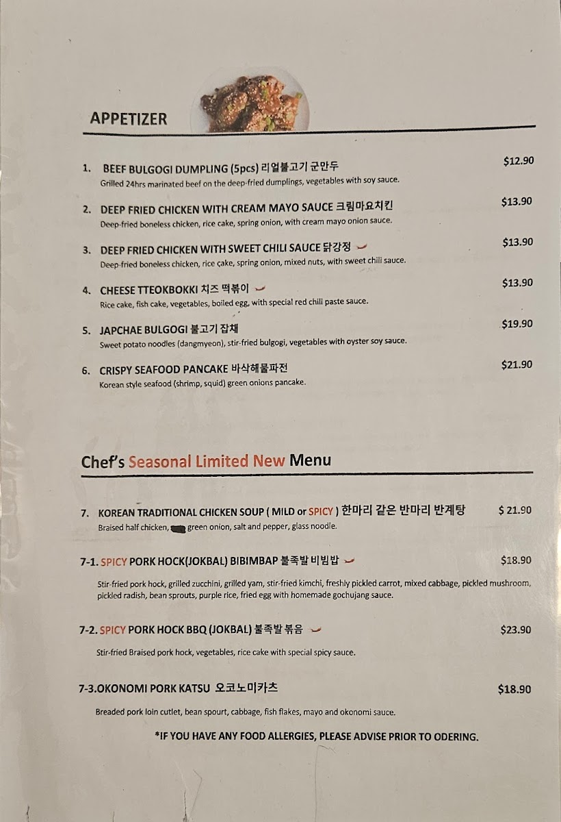 Rice Table Korean Kitchen offers a diverse and flavorful menu, perfect for those craving authentic Korean cuisine. Among the chef’s new seasonal specials, the Pork Katsu Bibimbap with Sweet Chili Sauce (양념돈까스 비빔밥) and Kimchi Gamjatang Soup (김치 감자탕) stand out. For those who enjoy a little spice, the Spicy Pork Belly Bibimbap (매운 삼겹살비빔밥) and Spicy Pork Belly BBQ (매운 삼겹살 바베큐) are great choices. The appetizer section features crowd-pleasers like the Beef Bulgogi Dumpling (5pcs) (리얼불고기 군만두) and Deep Fried Chicken with Cream Mayo Sauce (크림마요치킨), as well as the irresistible Cheese Tteokbokki (치즈떡볶이). For a more hearty option, the Japchae Bulgogi (불고기잡채) is a must-try. The bibimbap offerings, such as Bulgogi Bibimbap (불고기 비빔밥) and Beef Short Ribs Bibimbap (LA 갈비 비빔밥), offer a delightful mix of textures and flavors. Korean soups, like the Gamjatang Spicy Soup (우거지감자탕) and Beef Tendon Soup (도가니탕), provide comforting and rich flavors. For a classic Korean BBQ experience, the Beef Bulgogi BBQ (소불고기) and Grilled Pork Belly BBQ (삼겹살 바베큐) are standout options. The Korean Pork Loin Katsu (옛날 경양식 돈까스) and its variations, including the Cheese Pork Katsu (치즈 덮까스) and Extra Hot Spicy Pork Katsu (매워 죽까스), offer a deliciously crispy and savory twist on the traditional katsu. Whether you’re in the mood for a spicy kick or a comforting bowl, Rice Table Korean Kitchen delivers a satisfying and authentic dining experience.